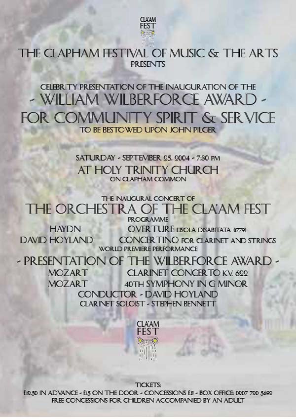 On Saturday, September 25th - Cla'am Fest Presents A Festival Special Event - the Orchestra of the Cla'am Fest - Music by Pappa Haydn, Overture L'Isola Disabitata (1779), David Hoyland's Concertino for Clarinet & Strings and Mozart's 40th Symphony in G minor plus his beloved Clarinet Concerto with international soloist - Stephen Bennett.